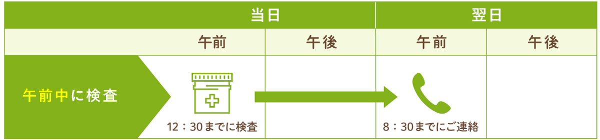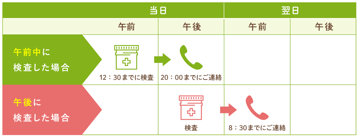 12:30までに検査をした場合、当日20:00までにお電話にて検査結果をお知らせいたします。